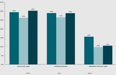 Omgørelsesprocenten i 2022 steg i forhold til 2021 med ca. 4 procentpoint for de kommunale sager og med ca. 2 procentpoint på arbejdsskadeområdet. Sager fra Udbetaling Danmark er nærmest uforandret fra 2021 til 2022, idet stigningen i omgørelserne kun er 1 procentpoint.