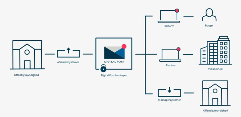 Kommunen sender digitale breve fra et afsendersystem, som kan variere fra kommune til kommune. Brevet leveres fra afsendersystemet til den digitale postløsning (Digital Post).