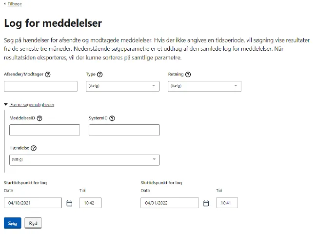 Det er muligt at foretage søgning på en række forskellige kriterier i ”Log for meddelelser”. Der kan blandt andet søges på modtager, det vil sige enten det CVR- eller CPR-nummer, som knytter sig til modtageren af det digitale brev. Det er også muligt at afgrænse søgeresultaterne, så der kun vises de breve, som er sendt til modtageren inden for en nærmere defineret periode mellem to datoer.