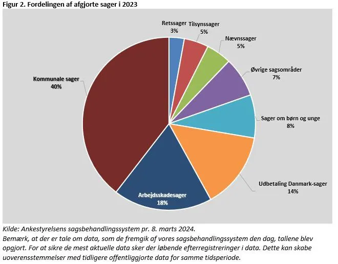 De kommunale social- og beskæftigelsessager udgør ca. 40 pct. af det samlede antal sager. Klagesager over afgørelser fra Arbejdsmarkedets Erhvervssikring og Udbetaling Danmark udgjorde henholdsvis ca. 18 pct. og 14 pct. af Ankestyrelsens sager i 2023.